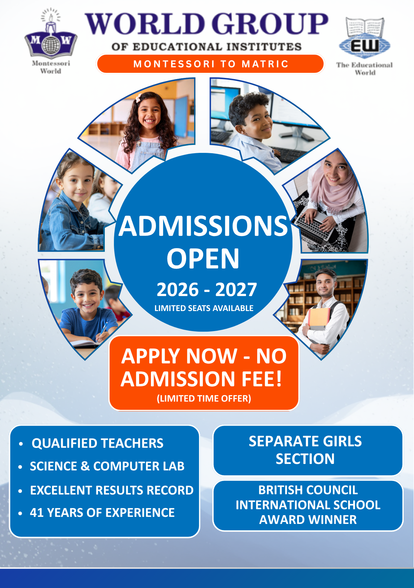 We proudly operate two distinct schools: Montessori World, providing a nurturing Montessori environment for young learners aged 2.5 to 5 years, and The Educational World, delivering the internationally recognized Cambridge curriculum from Class 1 onwards